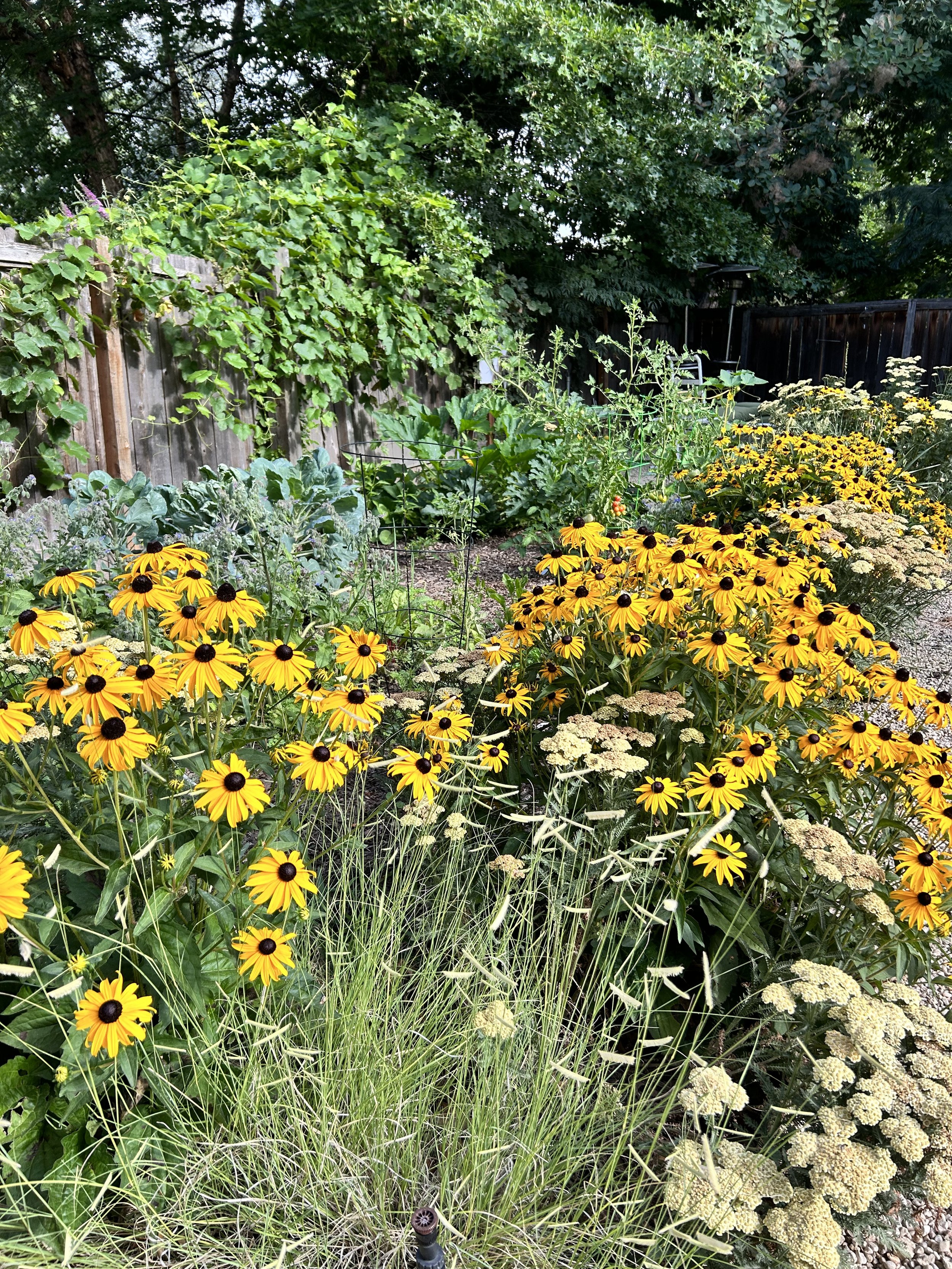 Black-eyed Susan, grama grass, and yarrow border a vegetable garden.