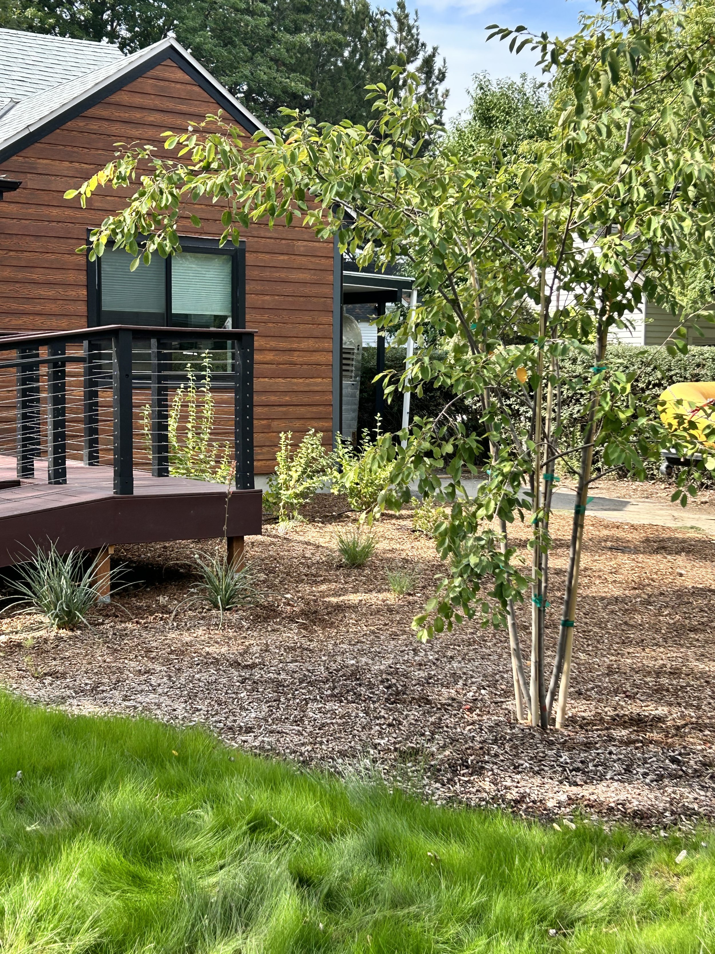 Serviceberry tree and no-mow fescue make for a medium to low water use landscape.